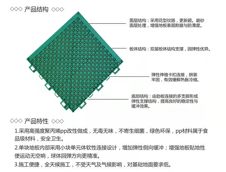 面層采用花型紋路,磨砂面層處理,增加地板表層耐磨和防滑度。板體結(jié)構(gòu),雙層板體結(jié)構(gòu),回彈優(yōu)異。底部結(jié)構(gòu),由肋板連接的多支腳形成彈性支撐結(jié)構(gòu),提高良好的穩(wěn)定性和緩沖效果。