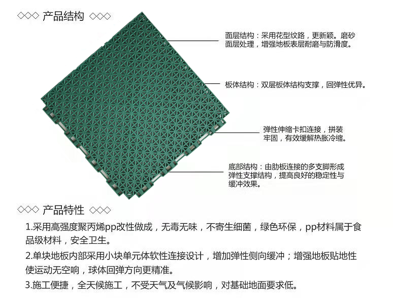 面層采用花型紋路,磨砂面層處理,增加地板表層耐磨和防滑度。板體結(jié)構(gòu),雙層板體結(jié)構(gòu),回彈優(yōu)異。底部結(jié)構(gòu),由肋板連接的多支腳形成彈性支撐結(jié)構(gòu),提高良好的穩(wěn)定性和緩沖效果。